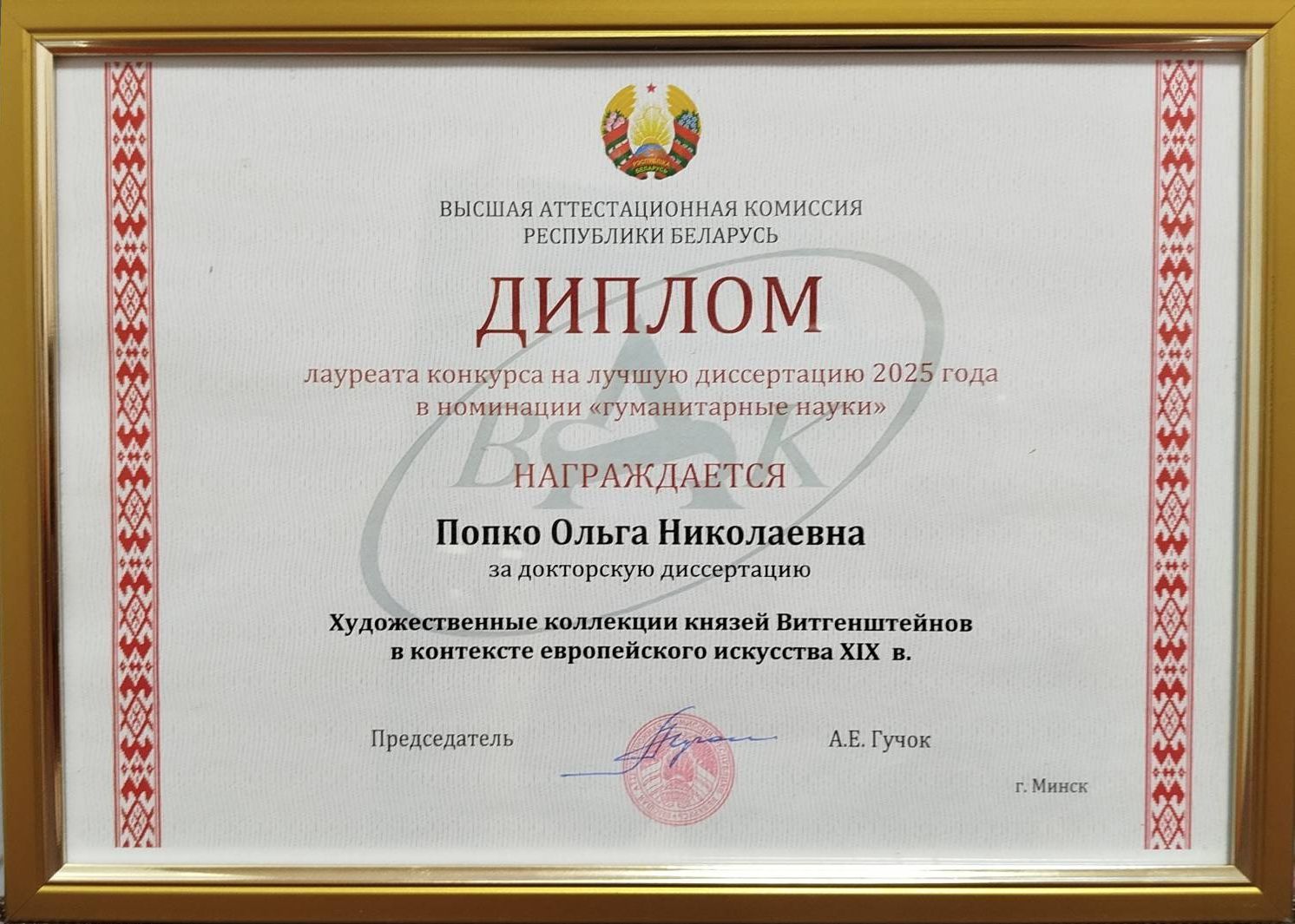 23 студзеня 2026 года на Урачыстым сходзе ў гонар Дня беларускай навукі быў уручаны дыплом лаўрэата конкурсу на найлепшую доктарскую дысертацыю 2025 г. у намінацыі «гуманітарныя навукі» Папко Вользе Мікалаеўне, дырэктару дзяржаўнай навуковай установы «Цэнтр даследаванняў беларускай культуры, мовы і літаратуры Нацыянальнай акадэміі навук Беларусі» (дысертацыя «Художественные коллекции князей Витгенштейнов в контексте европейского искусства XIX в.»).